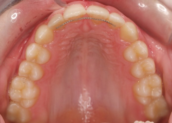 Ahora la paciente está en contención con férulas superior e inferior más contención fija inferior.